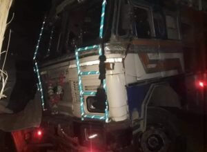 ट्रक असंतुलित होकर चाय दुकान में घुसा , बाल बाल बचें दुकानदार।